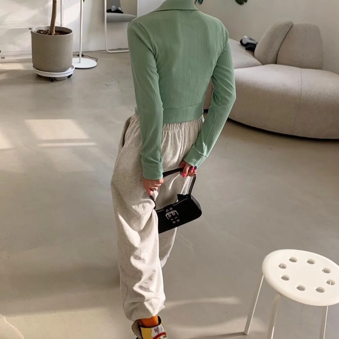 Lastly, for a more street look, unlike the photos above, these grey sweatpants are a big hit in South Korea, regardless of gender. Even though it’s the spring or fall season, people tend to match bright or dark grey sweatpants with streetwear tops like cropped cardigan or cropped tops. To go along with the effortless look, people match sneakers and a simple hand or sling bag. In the photo below, @o_mopo25 matched a pastel-mint cardigan with grey sweatpants and completed the look with vivid color sneakers. This look is adopted by many streetwear lovers in Korea, and who enjoys taking extra steps to seem more fashionable.